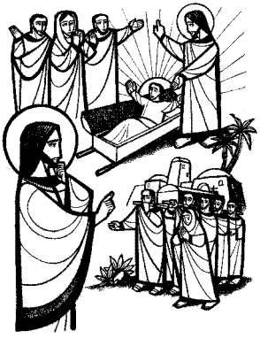 Jesús acercándose al ataúd, lo tocó. Los que lo llevaban se detuvieron.