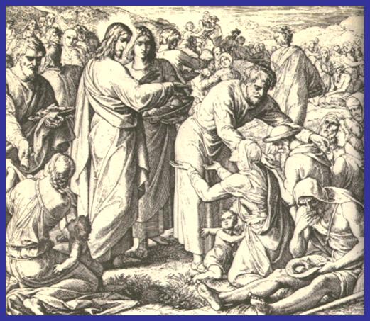 cansaron de recorrer, repartiendo pan y pescado, a aquella enorme multitud.